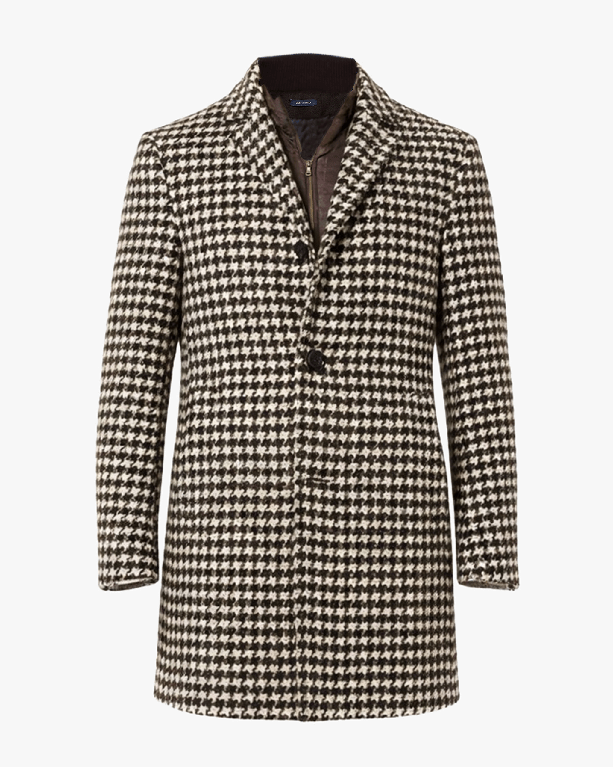 The Drake Coat captures the essence of Italian sophistication in a rich brown and cream houndstooth. Expertly woven by Vitale Barberis in Italy, its luxurious blend of alpaca, virgin wool, and mohair offers exceptional softness and texture. A removable nylon bib adds functional warmth and a contemporary layered dimension. With a mid-thigh silhouette, genuine horn buttons, and an interior chest pocket, makes it an essential piece for adaptable dressing.