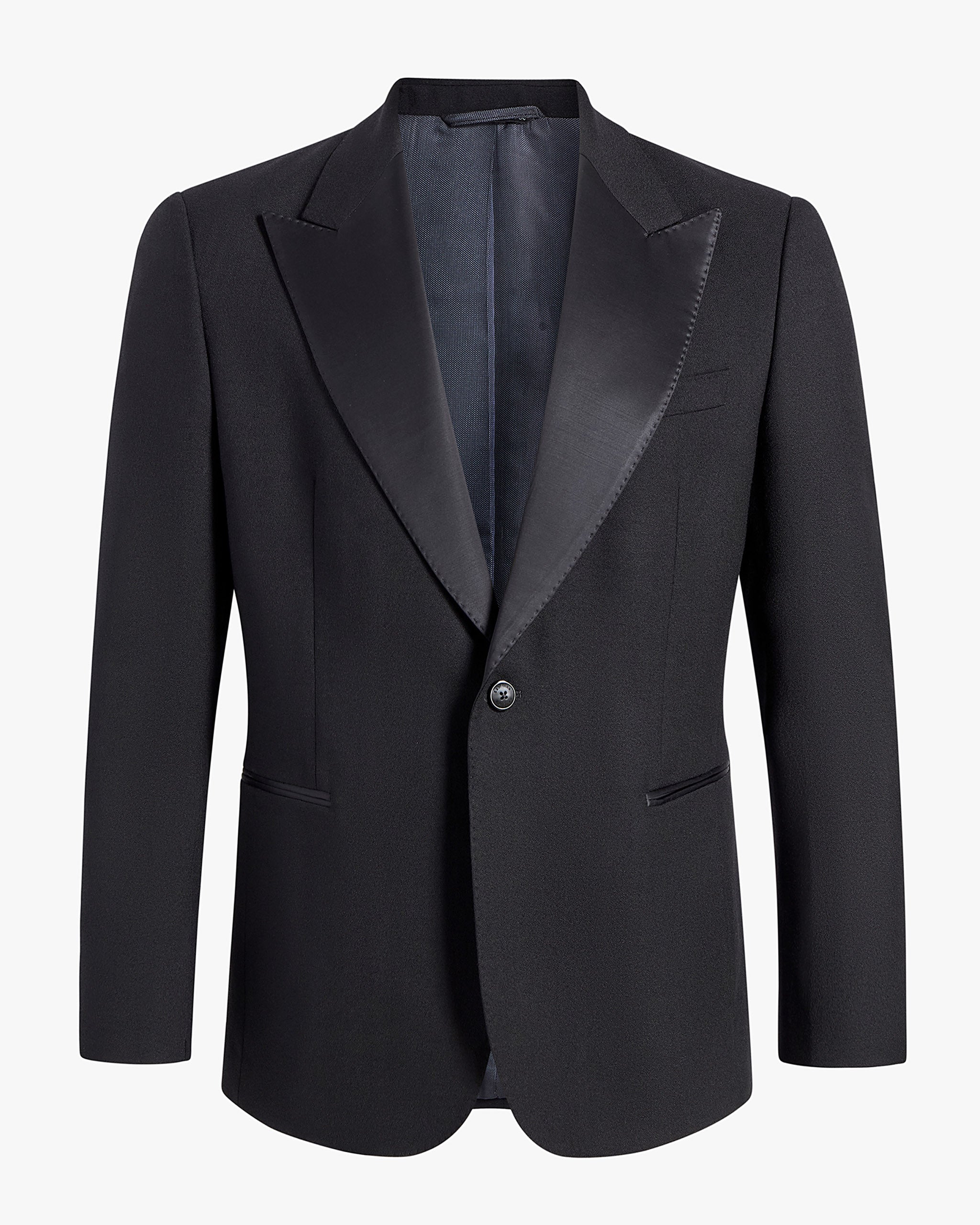Impeccably tailored and undeniably refined, the Winston Tuxedo Jacket is a modern take on classic black-tie dressing. Crafted from pure crepe wool in a sharp, single-breasted silhouette, it features peak satin lapels, a lightly structured shoulder, and a tapered waist for a clean, flattering profile. Finished with jetted pockets, satin-covered buttons, and a full lining, it’s a timeless tuxedo jacket designed for formal occasions that demand quiet sophistication.